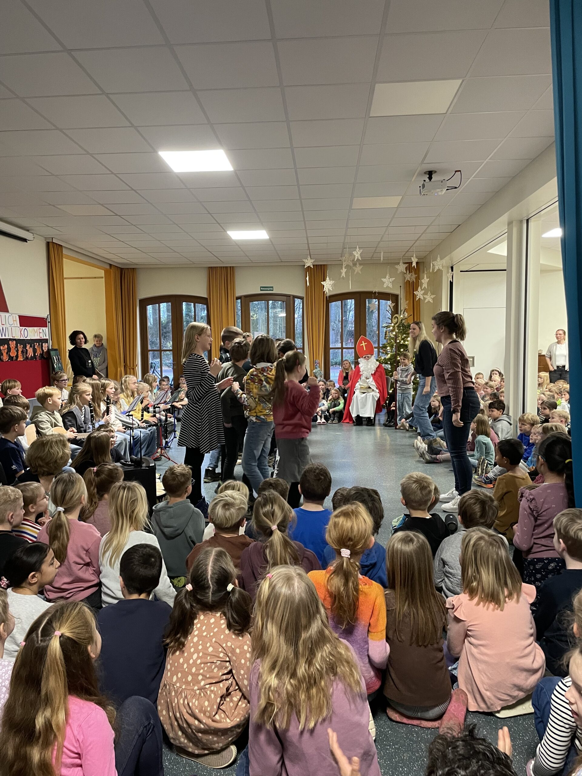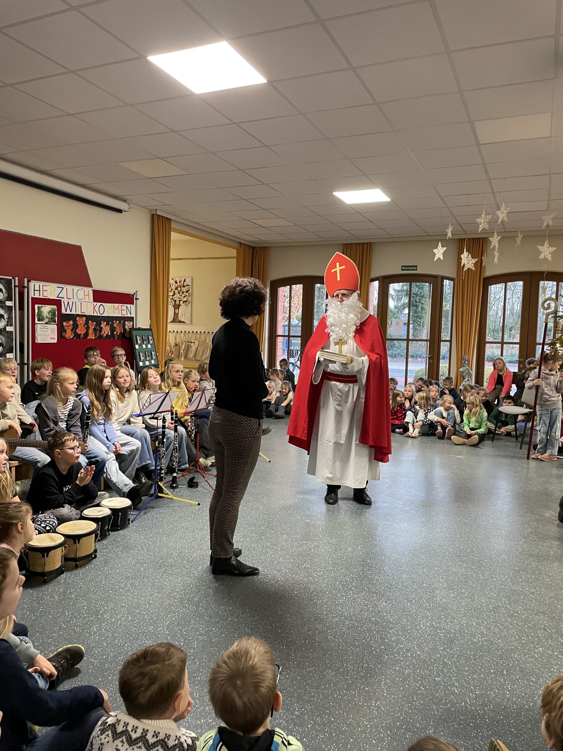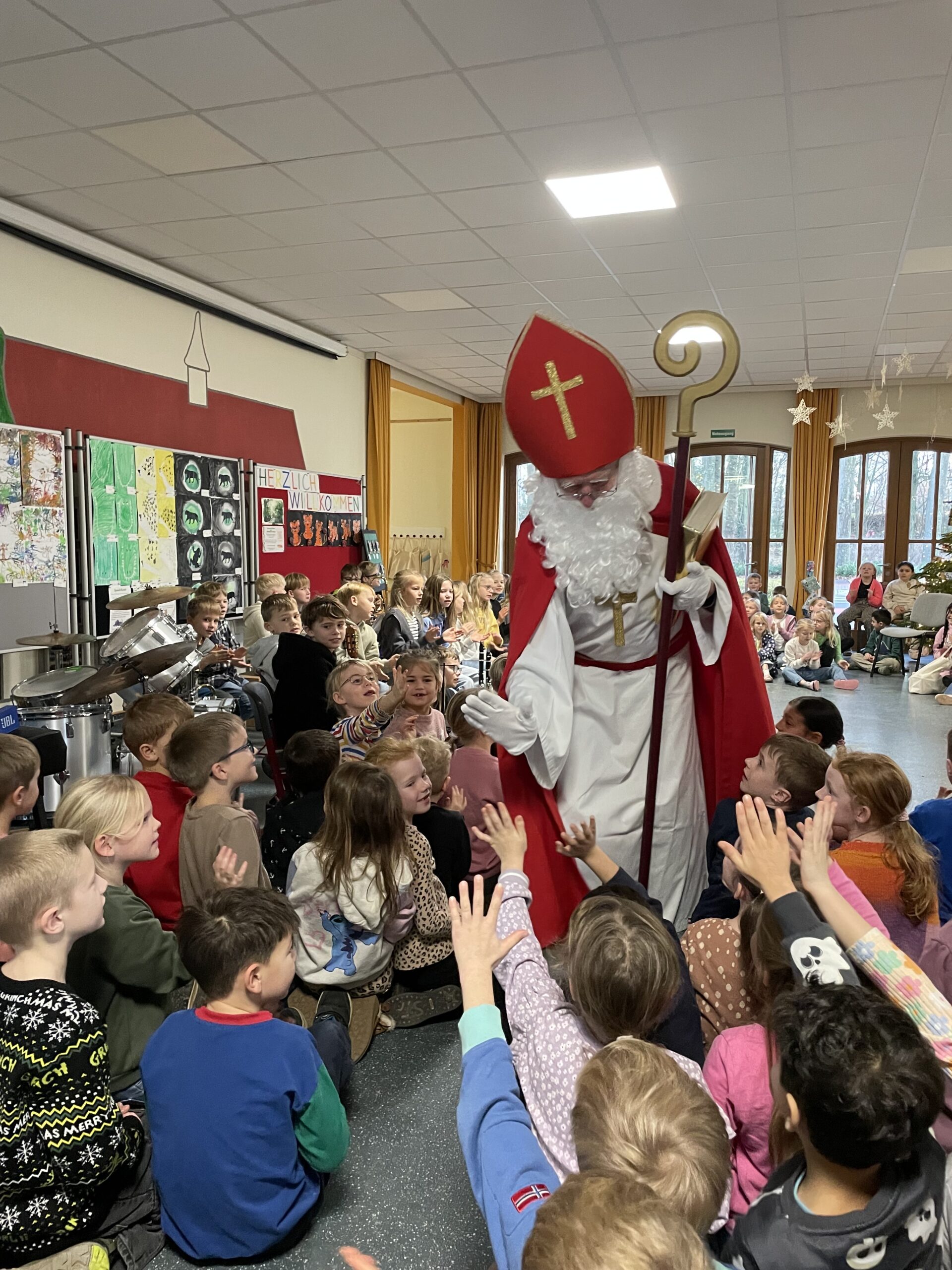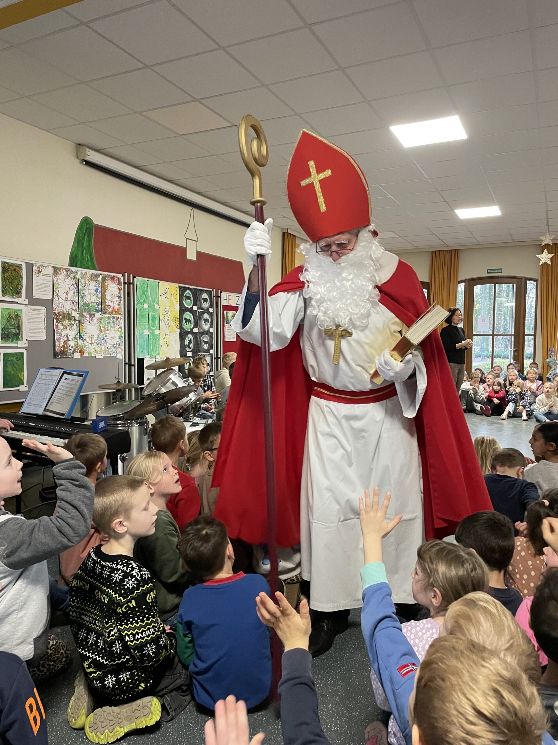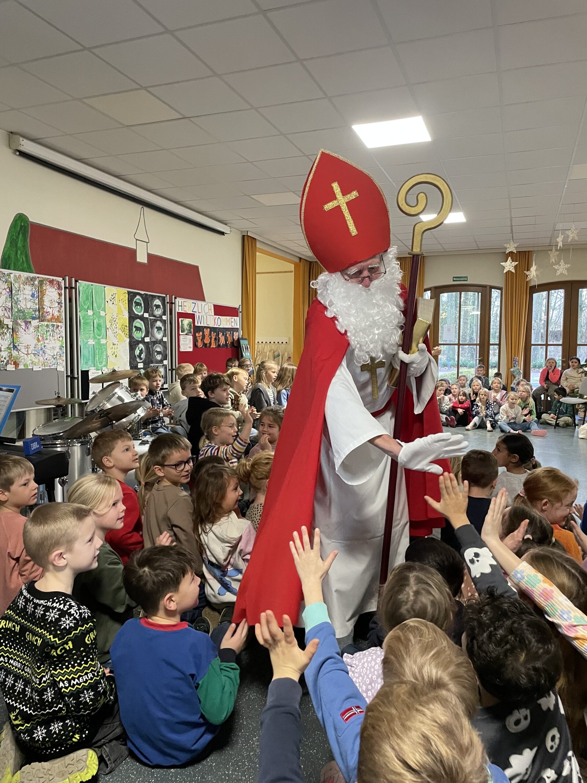 Mit großer Aufregung und leuchtenden Augen erwarteten die Kinder heute einen ganz besonderen Gast: den Nikolaus!  Als der Nikolaus morgens in die Eingangshalle kam, begrüßten ihn die Schülerinnen und Schüler mit wunderschönen Nikolausliedern.